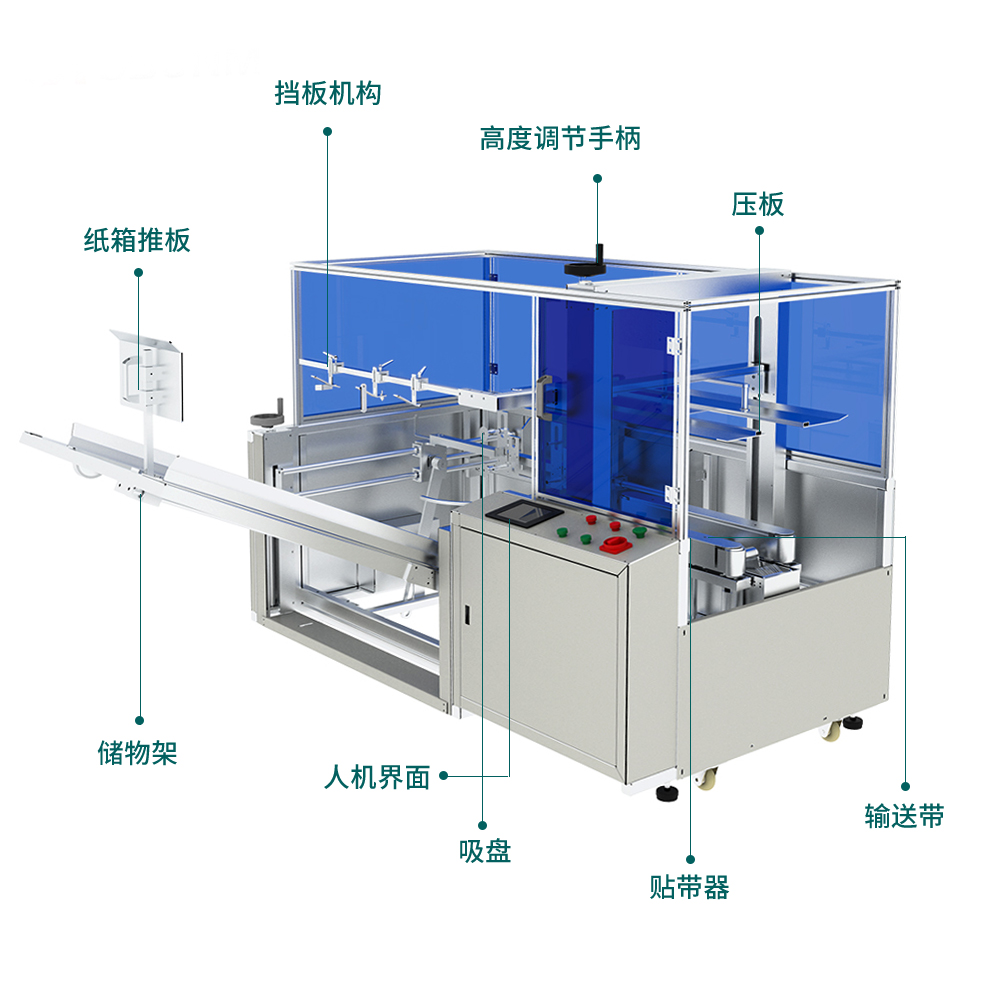 引进吸收日本德国先进技术制造,选用进口零部件,电器元件及气动元件纸箱储存采用卧式,可随时补充纸箱板,不需停机.自动预警提醒补充纸箱.